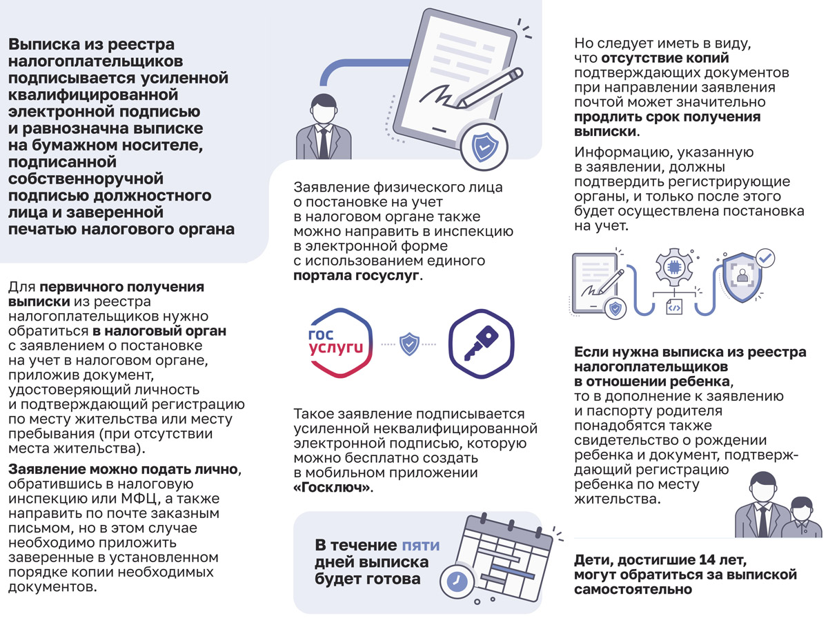 Если нужна выписка из реестра налогоплательщиков в отношении ребенка, то в дополнение к заявлению и паспорту родителя понадобятся также свидетельство о рождении ребенка и документ, подтверждающий регистрацию ребенка по месту жительства. Дети, достигшие 14 лет, могут обратиться за выпиской самостоятельно.