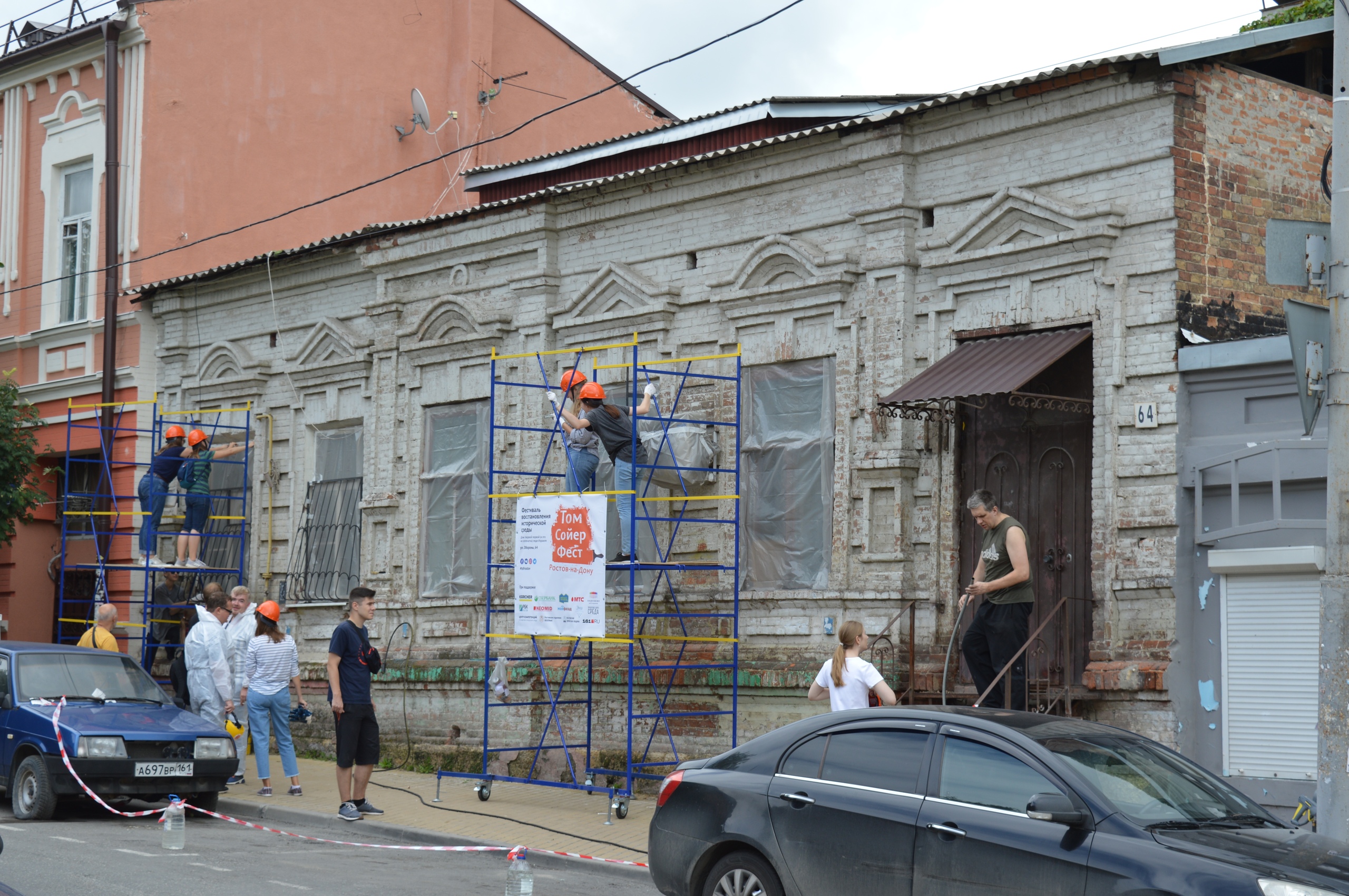 27.07.2019, /=РО=/В Ростове-на-Дону начал работать фестиваль восстановления исторической среды «Том Сойер Фест». Его участники очистили от слоев краски кирпичный фасад дома постройки XIX, который находится на улице Обороны. Это самый первый этап ремонта здания.