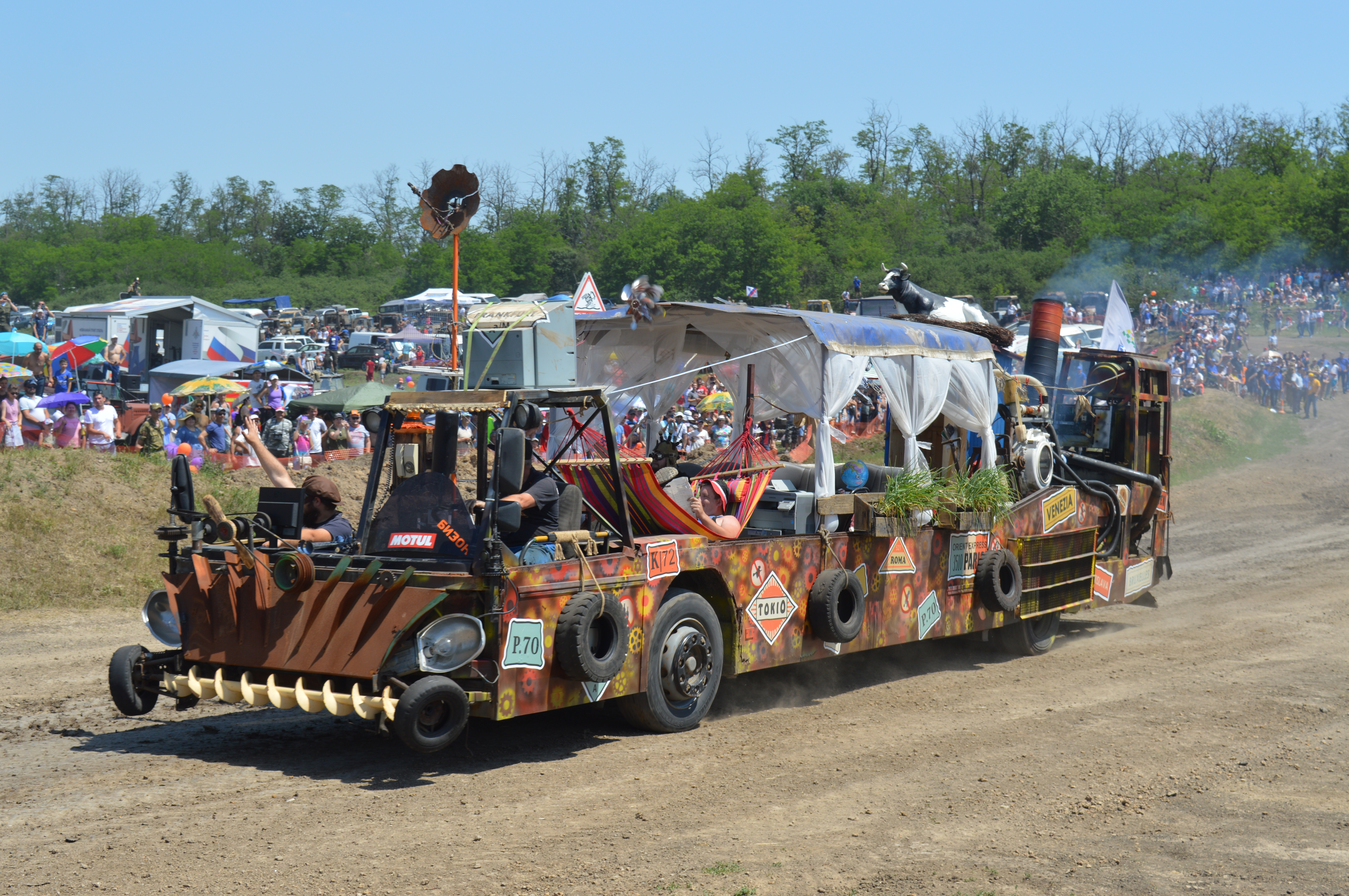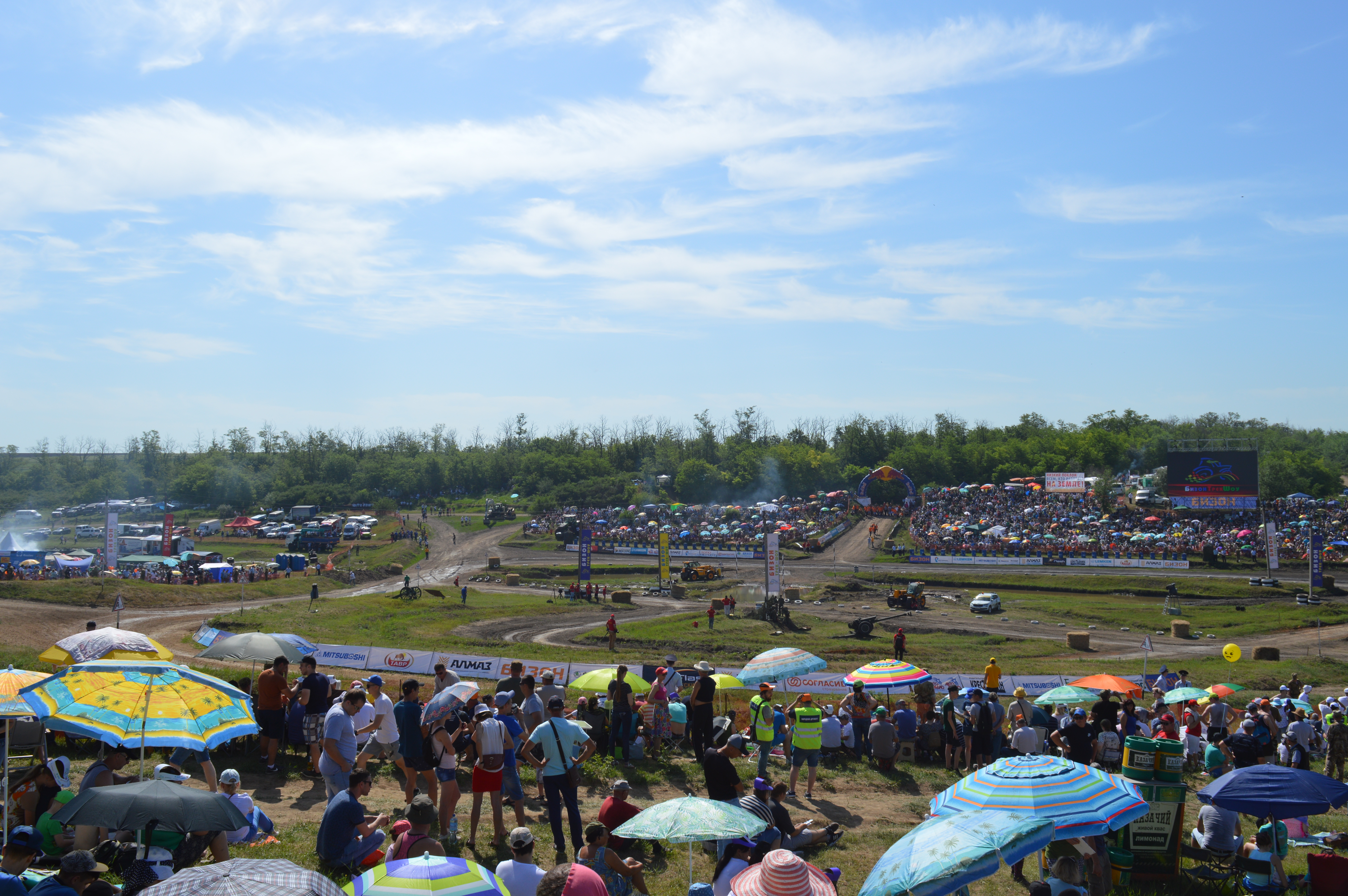 03.06.2019, /=РО=/Трактора влетали на огромной скорости в ямы с водой, падали на бок на крутых поворотах, врезались в столбы и видеооператоров. В небе летали парапланы, по гоночной трассе проезжал НТС (неопознанное транспортное средство). Экскаватор разломал «Жигули», вертолет привез важную суперохраняемую звезду. Так прошли XVII гонки на тракторах «Бизон-трек-шоу».